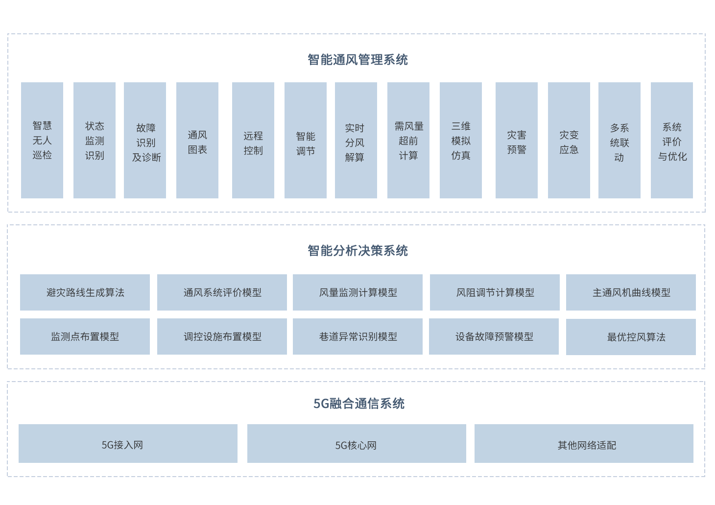 利用5G大带宽传输能力和机器视觉识别能力,通过数据分析与挖掘,实现故障诊断以及设备健康管理,对重要用风地点、过车风门、行人风门、关键通风点风窗等地点进行状态监测、安全报警和远程智能调控,达到精准调控的目的,加强通风系统的安全保障能力。
