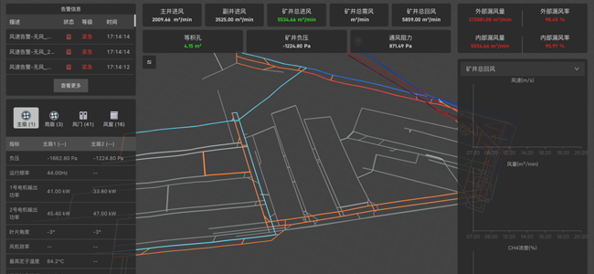通过通风网络实时解算,综合考虑瓦斯、粉尘、二氧化碳、温度、人员、防火等相关因素,精准计算实际需风量,实现对通风设备和设施远程智能调控。