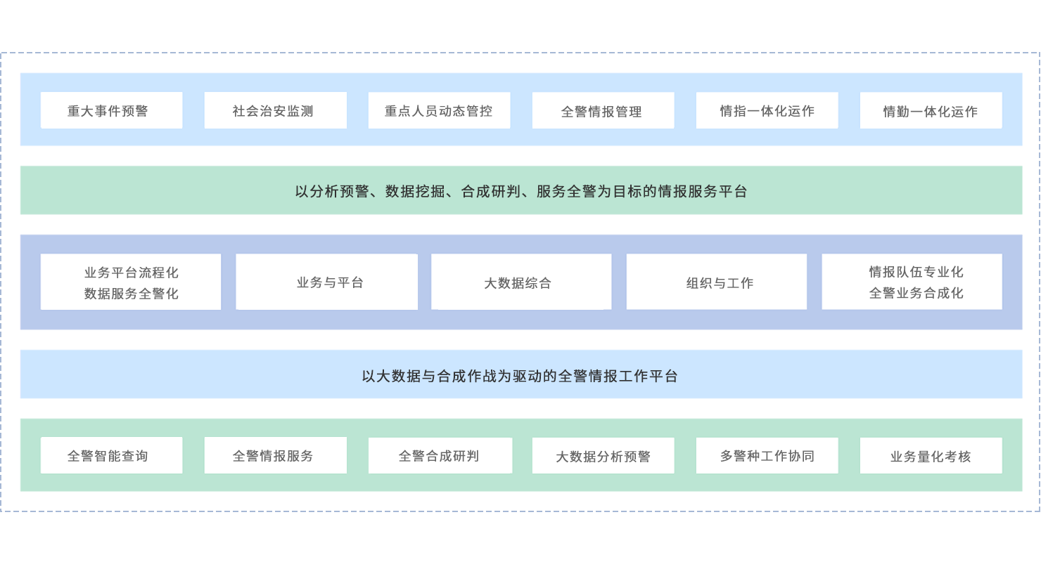 按照公安部“四项建设”的总体部署(基础信息化建设、警务实战化建设、执法规范化建设、队伍正规化建设)。紧密结合加强立体化社会治安防控体系建设工作, 贯彻落实公安部情报中心的决策部署,建立市级公安“数据汇聚、手段集成、权限集中、警种联动、智能实用、安全可靠、成果共享”的大数据情报合成作战平台, 助推“立体化社会治安防控”建设总体目标的实现。