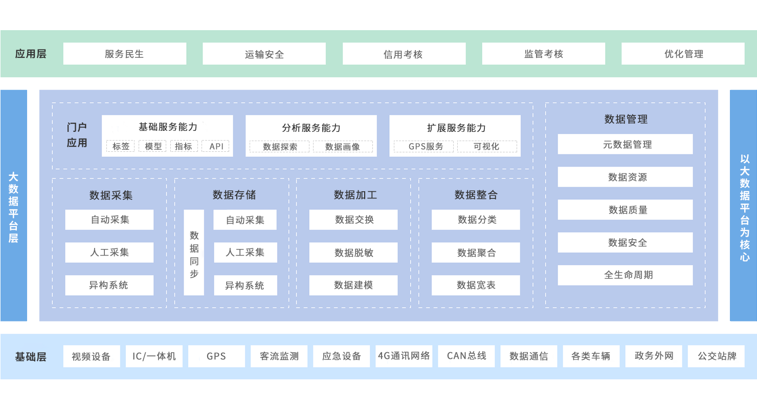 汇聚公交、出租、客运、危险品、道路运政、港航、汽车维修业等数据,打通数据壁垒,建立数据标准