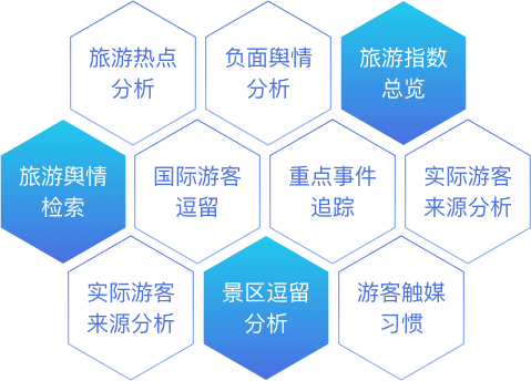 聚焦旅游管理热点,让智慧旅游管理看得清、看得懂、管得住打造主动型、全要素的智慧旅游精细化管理抓手,例如旅游舆情检索、旅游热点分析、负面舆情分 析、国际游客逗留、重点事件追踪、实际游客来源分析、实际游客来源分析、景区逗留分析、游客触媒习惯、旅游指数总览等。
