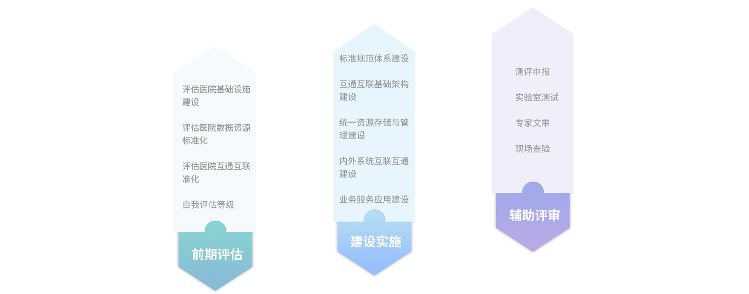 前期评估阶段,综合分析医院数据资源标准化与互联互通建设现状, 进行自我等级评估,并针对目标等级梳理测评建设内容。建设实施阶段, 基于医院信息平台构建院内外互联互通架构与应用, 量身定制国家医疗健康信息互联互通标准化成熟度等级测评工作开展方案, 其中核心产品以3A成绩通过国家医院信息互联互通标准化成熟度产品测评, 具有高度成熟性。辅助评审阶段,针对实验室测试、专家文审、 现场查验提供专业支撑,全面配合申报、答辩、软测、文审、预审、 现场检查等测评环节,助力医院稳定、高效通过“互联互通标准化成熟度测评”。