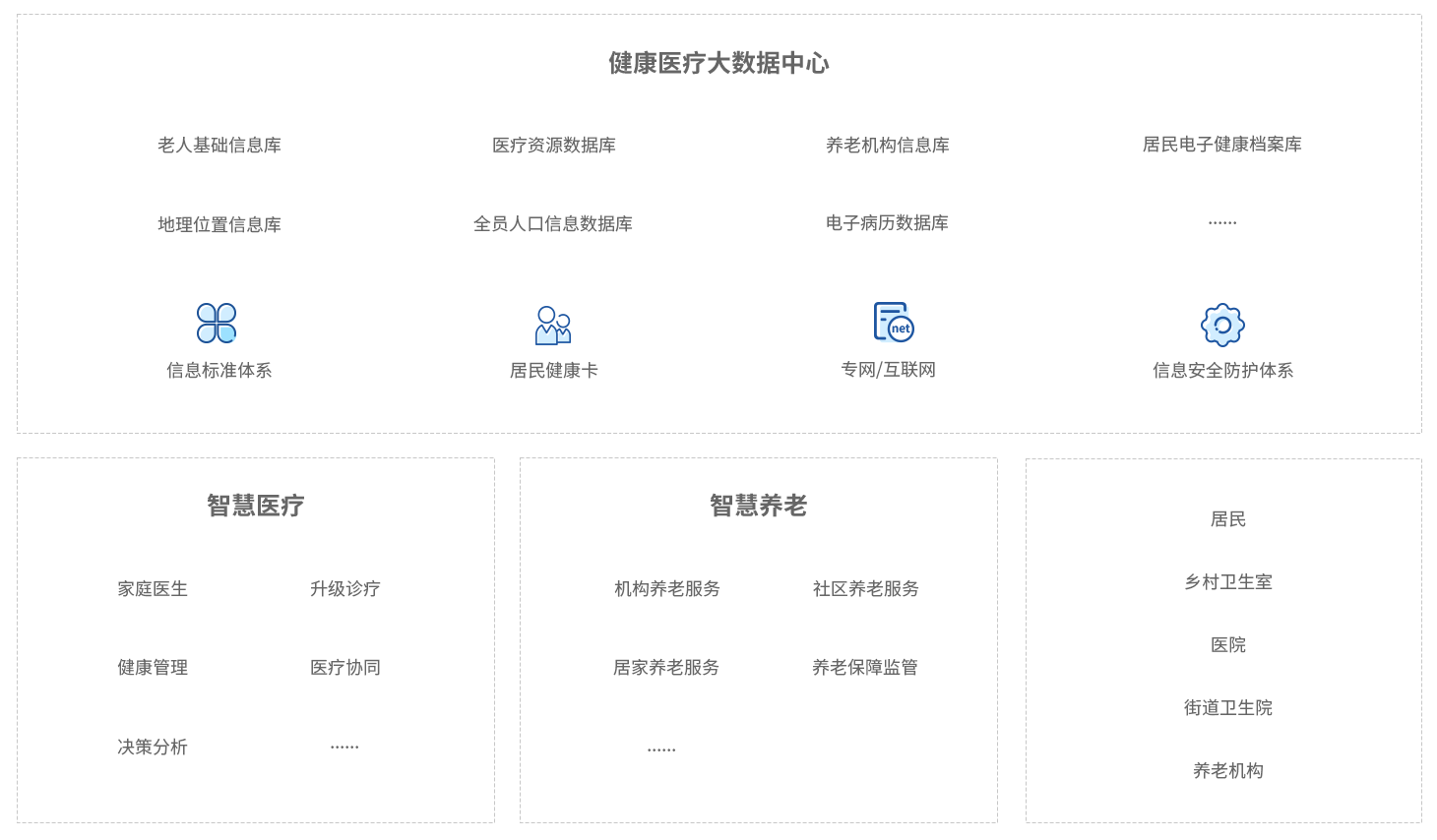 智慧健康解决方案,基于健康医疗大数据中心, 全方位汇聚融合健康医疗数据资源,以家庭医生业务推广为核心, 打造以智慧医疗和智慧养老为核心的智慧健康应用,全面提升居民健康管理能力、 基层医疗机构与养老机构服务能力,助力分级诊疗及医养结合模式落地。